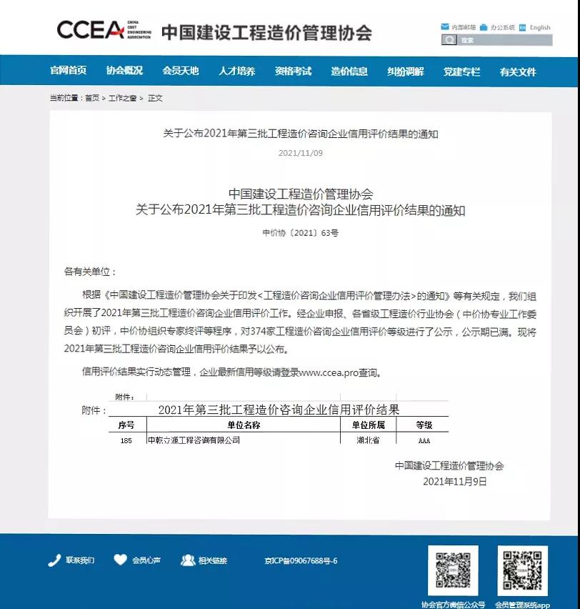 經(jīng)各省工程造價管理協(xié)會(中價協(xié)工作委員會)初評,中價協(xié)組織專家評審,從企業(yè)經(jīng)營業(yè)績、技術(shù)力量、履約能力等綜合實力出發(fā),在2021年度全國工程造價咨詢企業(yè)信用評價中,中乾立源工程咨詢有限公司被評為AAA級企業(yè)。