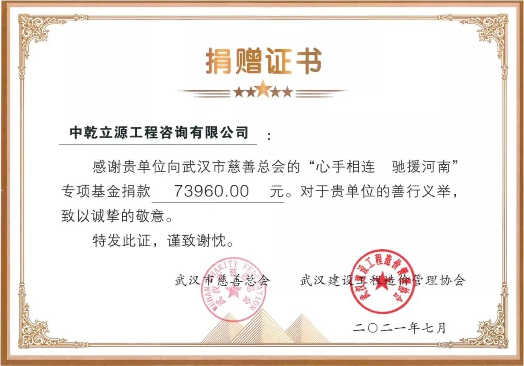 7月23日,中乾立源向河南省捐款73960元,用于河南省防汛救災(zāi)、群眾幫扶、衛(wèi)生防疫及災(zāi)后重建等工作,以實(shí)際行動(dòng)踐行習(xí)近平總書(shū)記對(duì)防汛救災(zāi)工作作出的重要指示,彰顯洪山經(jīng)濟(jì)開(kāi)發(fā)區(qū)優(yōu)秀黨建民企擔(dān)當(dāng)。