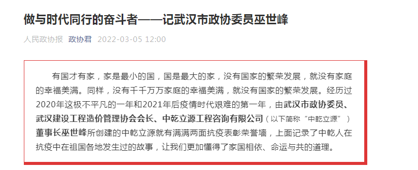 近日,中乾立源董事長巫世峰被多家媒體宣傳報道,引發(fā)廣泛關(guān)注,展現(xiàn)了他作為武漢市政協(xié)委員、洪山區(qū)政協(xié)委員的責(zé)任與擔(dān)當(dāng)。
