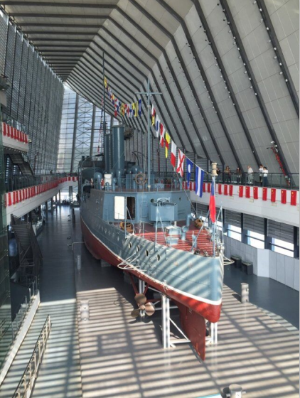 進入園區(qū)首先映入眼簾的是宏偉的中山艦博物館,博物館分為上、中、下三層,很是氣派。進入博物館內,我們看到了整修一新的中山艦。據(jù)介紹,中山艦原名“永豐艦”。它是以偉大的民主革命先行者孫中山先生的名字命名的中國近、現(xiàn)代史上的一代名艦。是1910年清政府向日本船廠訂購的,1913年完工返國,被編入北洋政府海軍。“中山”艦雖然噸位不大,但卻以它特有的歷史而成為名艦:1915-1916年,“永豐”艦響應孫中山先生的號召,參加了護國討袁運動,首創(chuàng)義舉,隨后它又經(jīng)歷過“護法運動”、“東征平叛”、“孫中山蒙難”、“中山艦事件”等重大歷史事件。在1938年10月武漢保衛(wèi)戰(zhàn)斗中“中山艦”勇戰(zhàn)強敵,遭遇多架日機輪番轟炸襲擊后沉沒于長江武漢金口江段,其中包括艦長在內的二十多名勇士為國殉職,從此長眠于江底近60年。