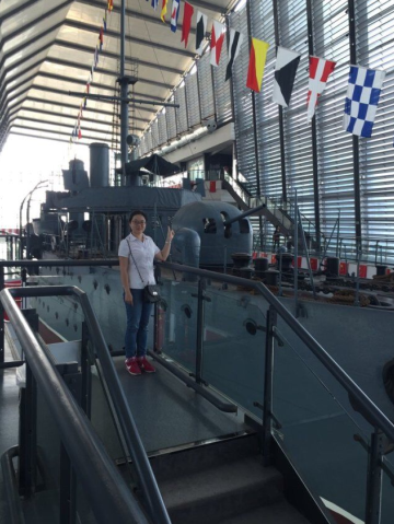 來到博物館中層,我們又觀看了兩個展廳。第一個展廳主要是陳列中山艦的出水文物。帶著歷史氣息的風扇、茶壺、煙灰缸、水壺,留下戰(zhàn)爭印跡的甲板殘骸、機關槍、望遠鏡;巨大的舵盤、斑斑駁駁的風速調節(jié)器無不在訴說著那一段風云變幻的歷史。第二個展廳主要展覽辛亥革命文物。那一枚枚精美的獎章象征著榮譽,使我們?yōu)橹腥A民族有著如此多的熱血兒女所驕傲。