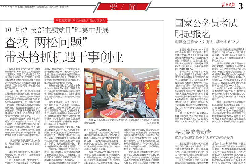 長(zhǎng)江日?qǐng)?bào)記者對(duì)我公司“支部主題黨日”活動(dòng)開展情況進(jìn)行采訪。(詳見長(zhǎng)江日?qǐng)?bào)2016年10月14日第三版)