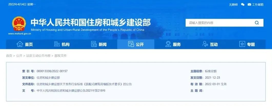 4月2日,住建部官網發(fā)布公告,批準《裝配式建筑用墻板技術要求》(JG/T578-2021)為行業(yè)標準。