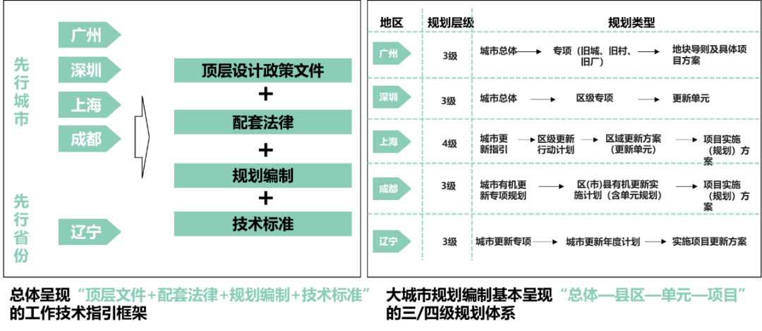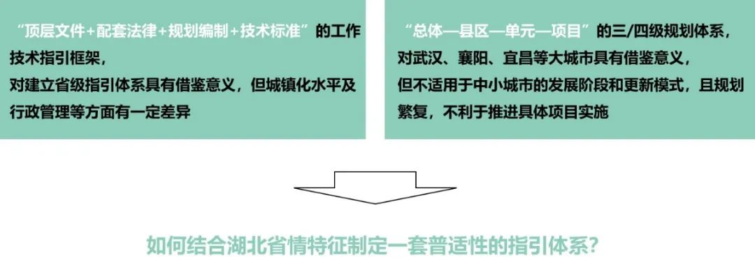 國內(nèi)城市更新先行地區(qū)總體呈現(xiàn)“頂層文件+配套法律+規(guī)劃編制+技術(shù)標(biāo)準(zhǔn)”的工作技術(shù)指引框架,對建立湖北省級指引體系具有借鑒意義,但城鎮(zhèn)化水平及行政管理等方面有一定差異。規(guī)劃編制基本呈現(xiàn)“總體—縣區(qū)—單元—項目”的三/四級規(guī)劃體系,對武漢、襄陽、宜昌等大城市具有借鑒意義,但不適用于中小城市的發(fā)展階段和更新模式,且規(guī)劃繁復(fù),不利于推進具體項目實施。