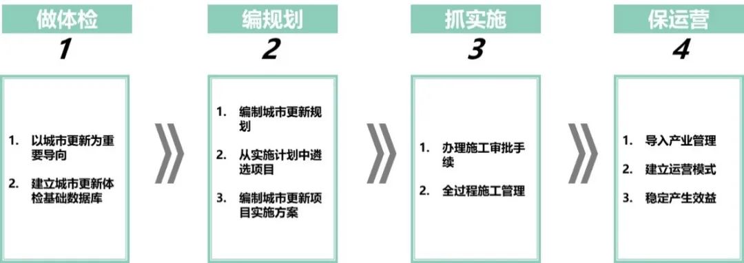 為更加高效有序推進城市更新工作,提出各地可參照“開展城市體檢—編制城市更新規(guī)劃—編制城市更新項目實施方案—城市更新項目施工、驗收—城市更新實施評估”的工作流程,建立城市更新全周期管理機制,推動城市更新項目早落地,早實施,早見效。