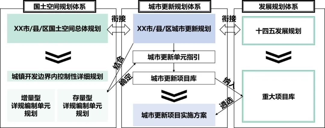 強調(diào)“無規(guī)劃不更新、簡規(guī)劃促更新”的原則,簡化規(guī)劃編制審批流程,建立“城市更新規(guī)劃—城市更新項目實施方案”的兩級基礎(chǔ)規(guī)劃體系,有需要的城市可在此基礎(chǔ)上進行城市更新單元規(guī)劃的編制或深化。