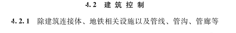 4.2.1 除建筑連接體、地鐵相關(guān)設(shè)施以及管線、管溝、管廊等市政設(shè)施外,建筑物及其附屬設(shè)施不應(yīng)突出道路紅線或用地紅線。