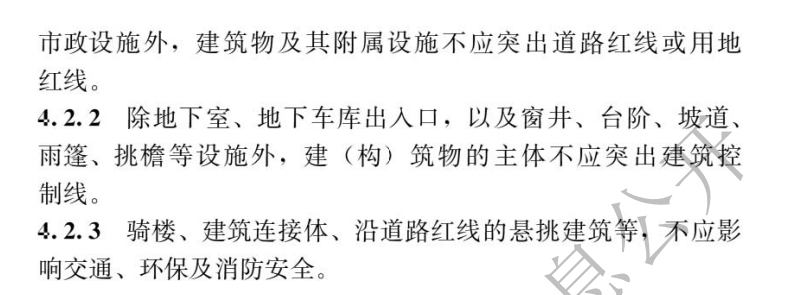 4.2.2 除地下室、地下車庫出入口,以及窗井、臺(tái)階、坡道、雨篷、挑檐等設(shè)施外,建(構(gòu))筑物的主體不應(yīng)突出建筑控制線。