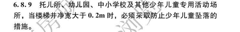 6.8.9 托兒所、幼兒園、中小學(xué)校及其他少年兒童專用活動(dòng)場所,當(dāng)樓梯井凈寬大于0.2m時(shí),必須采取防止少年兒童墜落的措施。