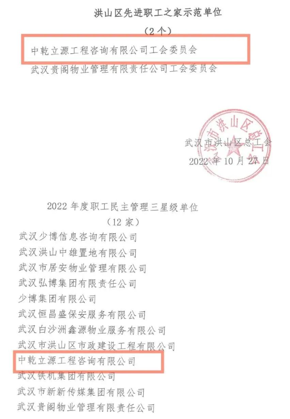 中乾立源工會喜獲2022年洪山區(qū)“先進職工之家示范單位”及“職工民主管理三星級單位”榮譽稱號!