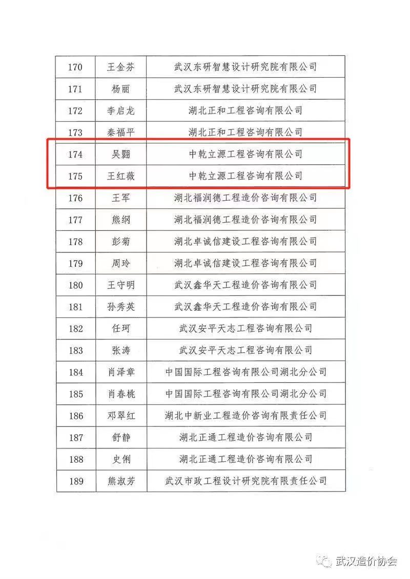 為調(diào)動(dòng)我市一級(jí)造價(jià)工程師的工作積極性,進(jìn)一步加強(qiáng)工程建設(shè)市場(chǎng)秩序,2022年12月20日,武漢市建設(shè)工程造價(jià)管理協(xié)會(huì)對(duì)全市189位在2022年度工作表現(xiàn)突出的一級(jí)造價(jià)工程師予以通報(bào)表揚(yáng),我司優(yōu)秀造價(jià)師吳翾,王紅薇榜上有名。