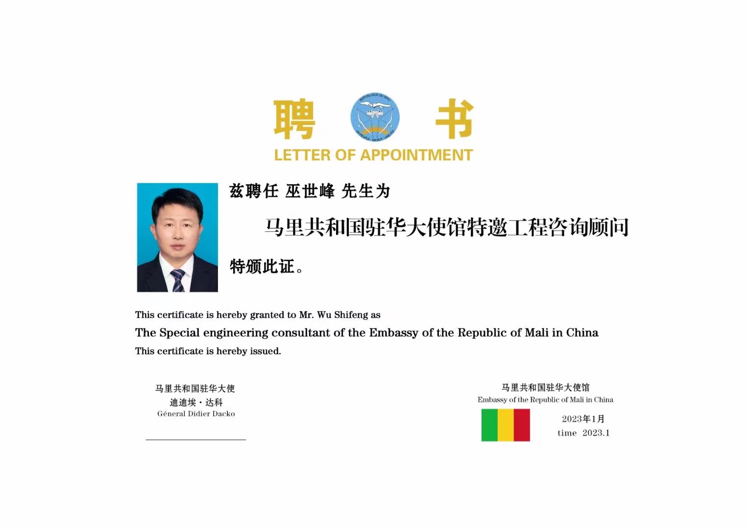 董事長(zhǎng)巫世峰獲聘馬里共和國(guó)駐華大使館特邀工程咨詢顧問