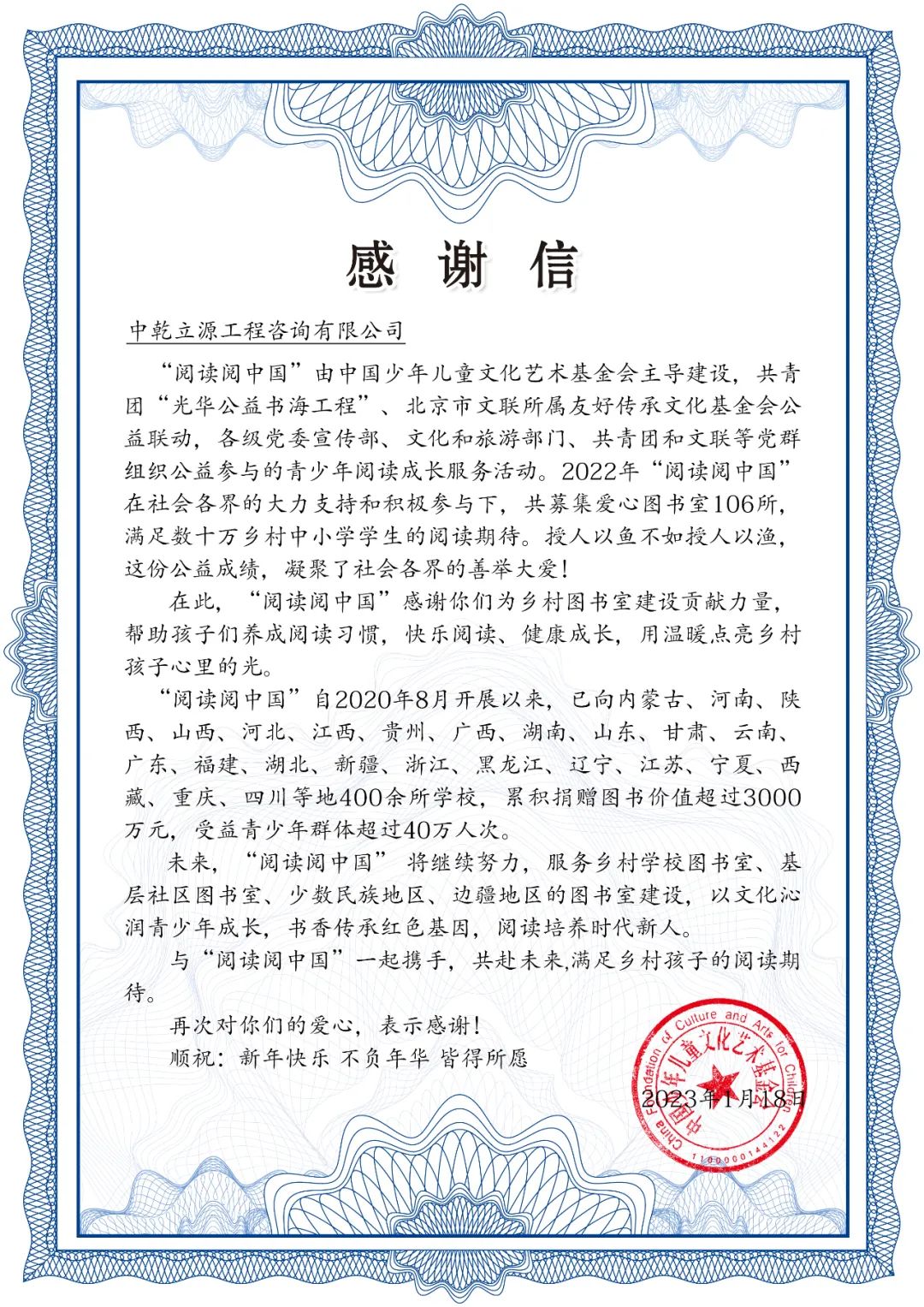 中乾立源收到來自中國(guó)少年兒童文化藝術(shù)基金會(huì)的感謝信,感謝公司為鄉(xiāng)村圖書館建設(shè)貢獻(xiàn)力量,幫助孩子們養(yǎng)成閱讀習(xí)慣,快樂閱讀,快樂成長(zhǎng),用溫暖點(diǎn)亮鄉(xiāng)村孩子心里的光。