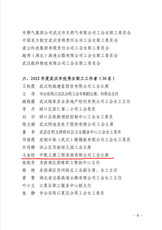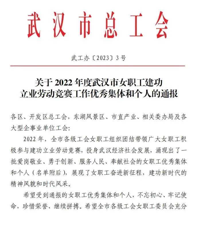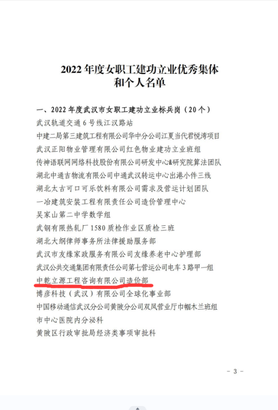 近日,武漢市總工會表彰了2022年度武漢市女職工建功立業(yè)勞動(dòng)競賽工作優(yōu)秀集體和個(gè)人。中乾立源造價(jià)部榮獲“2022年度女職工建功立業(yè)標(biāo)兵崗”,工會主席文金枝榮獲“2022年度武漢市優(yōu)秀女職工工作者”稱號!