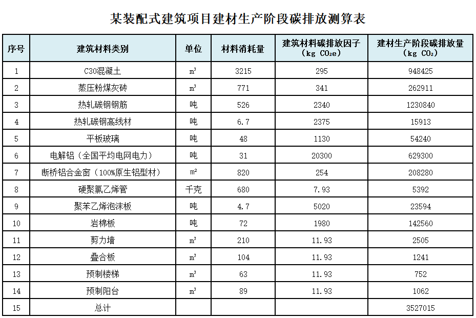 某裝配式建筑項目案例的建筑材料類別與材料消耗量如下表所示,建材碳排放因子根據(jù)經(jīng)第三方審核的建材碳足跡數(shù)據(jù)與標準附錄D數(shù)據(jù)計算,可得到建材生產(chǎn)階段碳排放量(kg CO2)。