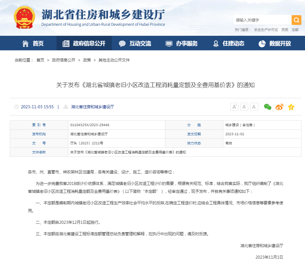 為進(jìn)一步完善湖北省2018版計價依據(jù)體系,滿足城鎮(zhèn)老舊小區(qū)改造工程計價的需要,由中乾立源工程咨詢有限公司等單位參與編制的《湖北省城鎮(zhèn)老舊小區(qū)改造工程消耗量定額及全費(fèi)用基價表》,經(jīng)湖北省住房和城鄉(xiāng)建設(shè)廳批準(zhǔn)正式發(fā)布,自2023年12月1日起施行。
