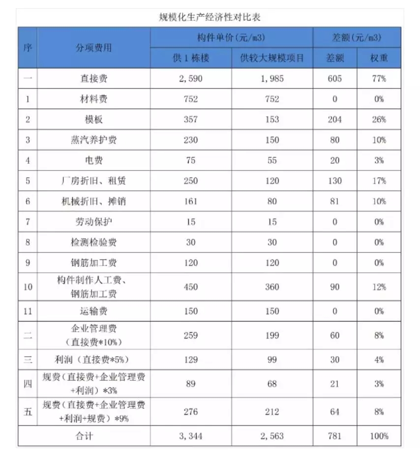 住建部科技中心對全國12個典型樓盤單棟樓與規(guī)?;瘧?yīng)用裝配式建筑的成本差異進行對比分析,發(fā)現(xiàn)規(guī)?;a(chǎn)對降低生產(chǎn)成本的貢獻較大,使構(gòu)件單價降低了780元/m3,降幅約23%。