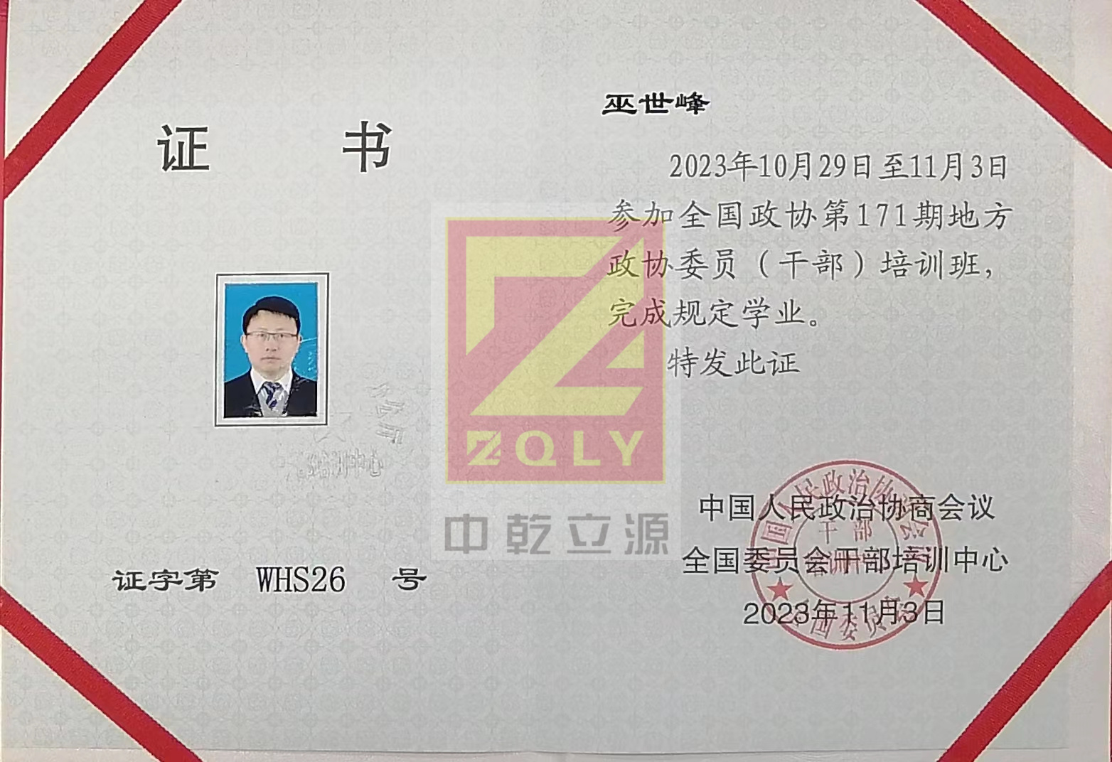 【2023】董事長巫世峰全國政協(xié)委員培訓結業(yè)證書
