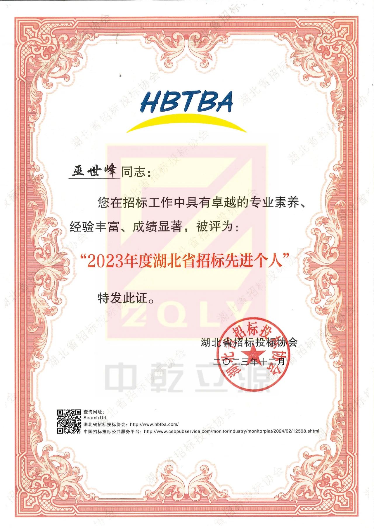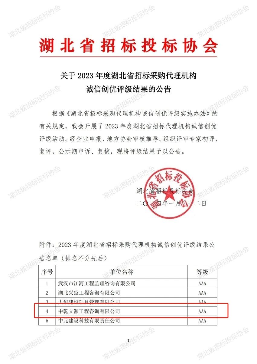 近日,湖北省招標投標協(xié)會發(fā)布“2023年度湖北省招標采購代理機構誠信創(chuàng)優(yōu)評級結果”。中乾立源榮獲“2023年度湖北省招標采購代理機構誠信創(chuàng)優(yōu)等級AAA”稱號。董事長巫世峰榮獲“2023年度湖北省招標先進個人”稱號。