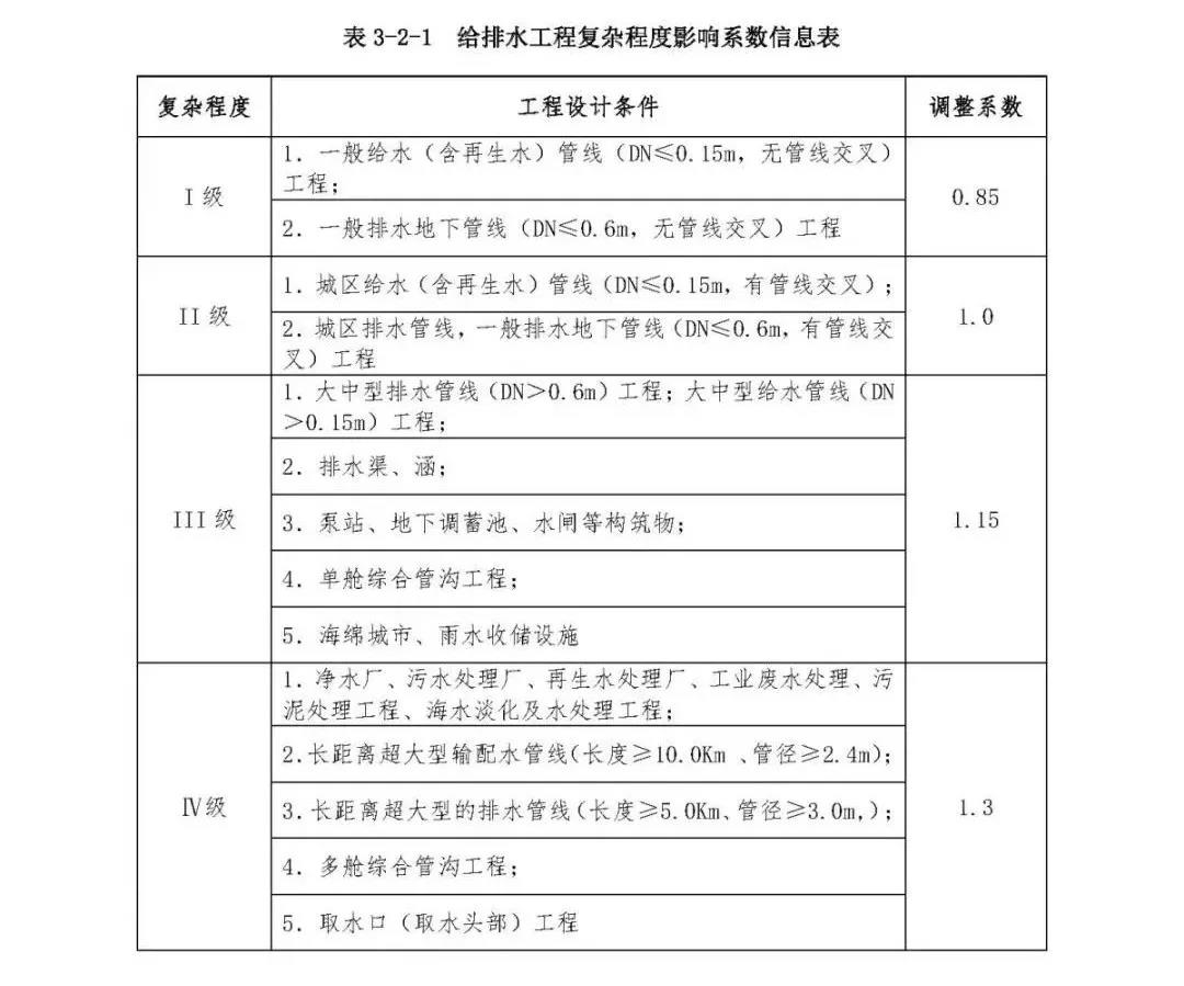 表3.市政工程設計復雜程度影響系數(shù)及成本附加系數(shù)信息表