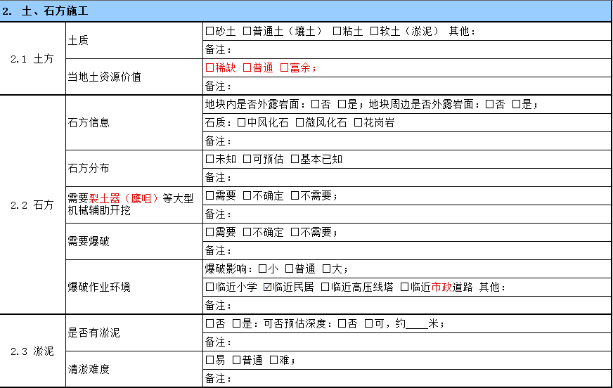 投資拓展小組人員只需要根據(jù)踏勘清單一一完成相關(guān)要素的調(diào)研,避免人為經(jīng)驗(yàn),缺漏相關(guān)調(diào)研因素,某標(biāo)桿企業(yè)的“土方踏勘清單樣表”如下: