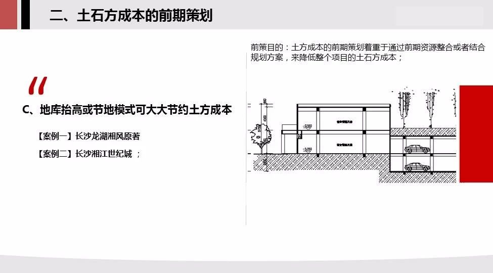 對(duì)于需要大量外運(yùn)土方的項(xiàng)目,如果能夠抬高地庫或者采用節(jié)地模式,則可大大減少土方開挖成本。
