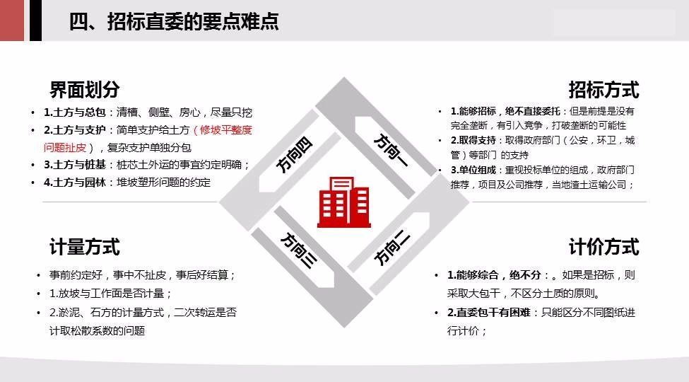 4.招標(biāo)直委要點(diǎn)難點(diǎn):招標(biāo)方式,計(jì)價(jià)方式,計(jì)量方式,界面劃分進(jìn)行重點(diǎn)介紹;