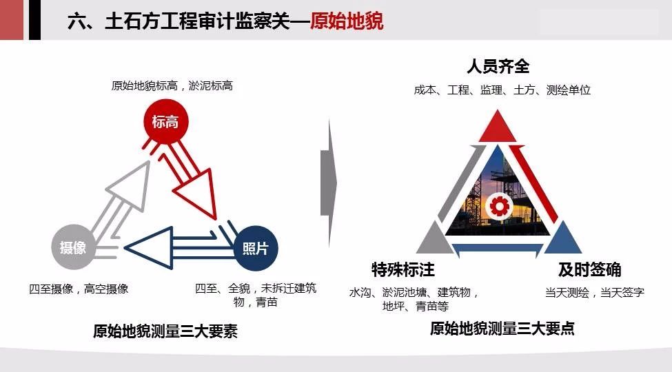 土方成本較為敏感,過程合規(guī)性與資料的合規(guī)性缺一不可,三大方面要重點(diǎn)關(guān)注:測(cè)繪方式,原始地貌,開挖方案;