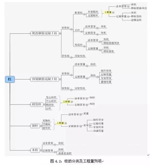 常見的柱子按材質(zhì)分可分為現(xiàn)澆鋼筋混凝土柱、預(yù)制鋼筋混凝土柱、砌筑柱和鋼柱四種,其工程量列項分為清單算量和定額算量兩種,見圖4.2