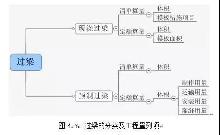 常見的梁按材質(zhì)分可分為現(xiàn)澆鋼筋混凝土梁、預(yù)制鋼筋混凝土梁、鋼梁三種,其工程量列項分為清單算量和定額算量兩種,見圖4.3