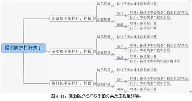屋面防護(hù)欄桿一般起防護(hù)和裝飾作用,按清單定額將其分為金屬扶手、硬木扶手、熟料扶手三種,其工程量列項見圖4.11