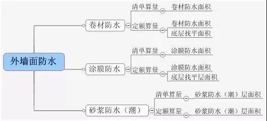 外墻防水一般分卷材防水、涂膜防水、砂漿防水防潮層三種情況,其工程量列項見圖4.49