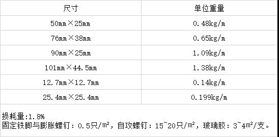;框架式用:12、20、25、38mm;板式用:20、25、32mm。每種釘0.2kg/㎡