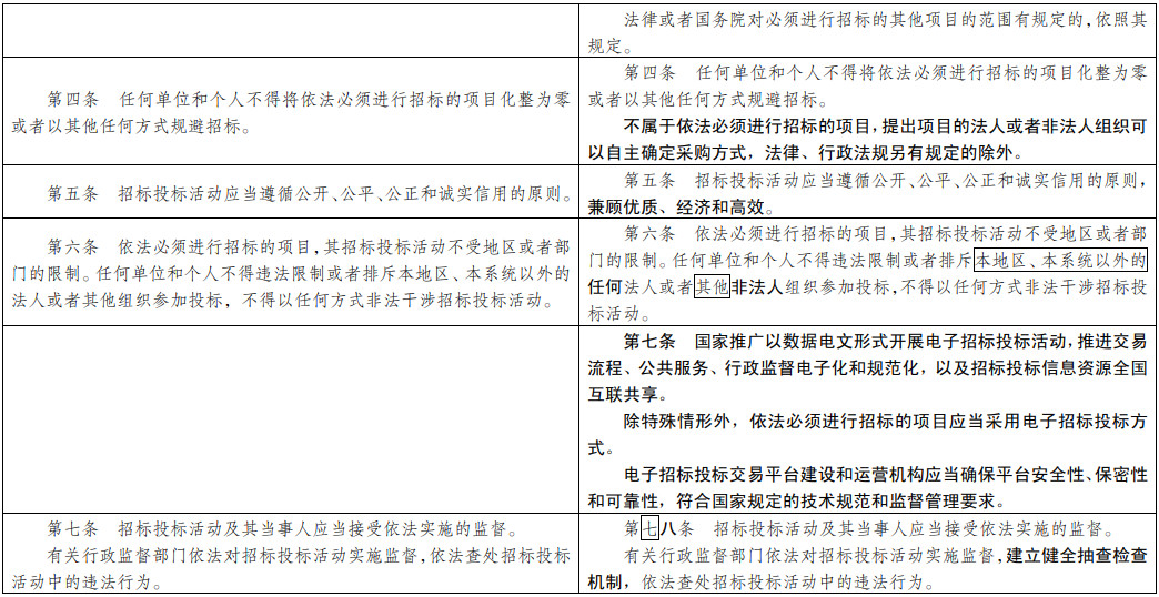 (七)為招投標(biāo)實(shí)踐發(fā)展提供法治保障。明確總承包招標(biāo)、集中招標(biāo)、兩階段招標(biāo)等招標(biāo)組織形式的法律地位。積極促進(jìn)電子招投標(biāo)推廣應(yīng)用。明確政府和社會(huì)資本合作項(xiàng)目遴選社會(huì)資本方有關(guān)招標(biāo)要求。擴(kuò)大了允許自然人投標(biāo)的項(xiàng)目范圍。
