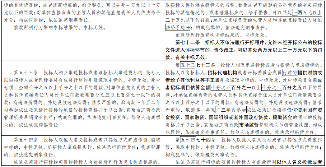 (二)提高招投標(biāo)公開透明度和規(guī)范化水平。大幅增加招標(biāo)公告、招標(biāo)文件、中標(biāo)公示等應(yīng)當(dāng)載明的事項(xiàng)范圍。充分保障潛在投標(biāo)人和投標(biāo)人對(duì)資格預(yù)審、評(píng)標(biāo)、定標(biāo)結(jié)果的知情權(quán)。借鑒國(guó)際慣例首次對(duì)招標(biāo)計(jì)劃公開作出規(guī)定。大力推廣使用標(biāo)準(zhǔn)招標(biāo)文件。