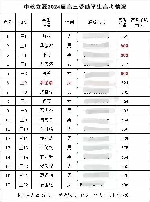特別值得一提的是,今年——我們助學(xué)計劃實施的第十個年頭,萬安中學(xué)2024屆高三受助學(xué)生在高考中取得了令人矚目的成績。在我們的支持下,他們不負韶華,勇敢追夢。其中,三人高考成績突破600分大關(guān),展現(xiàn)了卓越的學(xué)習(xí)能力和不懈的奮斗精神;更有11名同學(xué)超過特控線,這意味著他們向著更高學(xué)府邁出了堅實的一步。最為振奮的是,所有17名受助的高三學(xué)生,無一例外,全部達到了本科錄取分數(shù)線,實現(xiàn)了人生的又一次飛躍。
