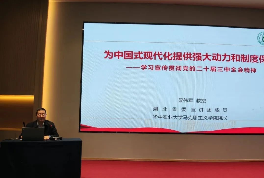 梁偉軍教授以《為中國式現(xiàn)代化提供強大動力和制度保障——學習宣傳貫徹黨的二十屆三中全會精神》為主題,從多個角度深入剖析了三中全會的核心內容及其深遠影響。通過引用華中農(nóng)業(yè)大學最新的科研成果如“長在樹上的茄子”和“新品草莓番茄”的實例,梁教授生動地闡述了科技創(chuàng)新與產(chǎn)業(yè)創(chuàng)新相結合的重要性。接近兩小時的精彩演講讓參會者深受啟發(fā),大家紛紛表示收獲頗豐。