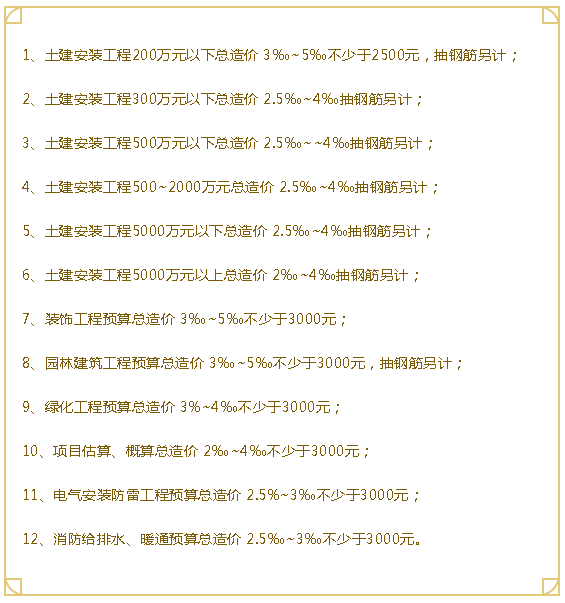 3、裝飾工程結(jié)算總造價(jià) 3‰~1%不少于 3000元。