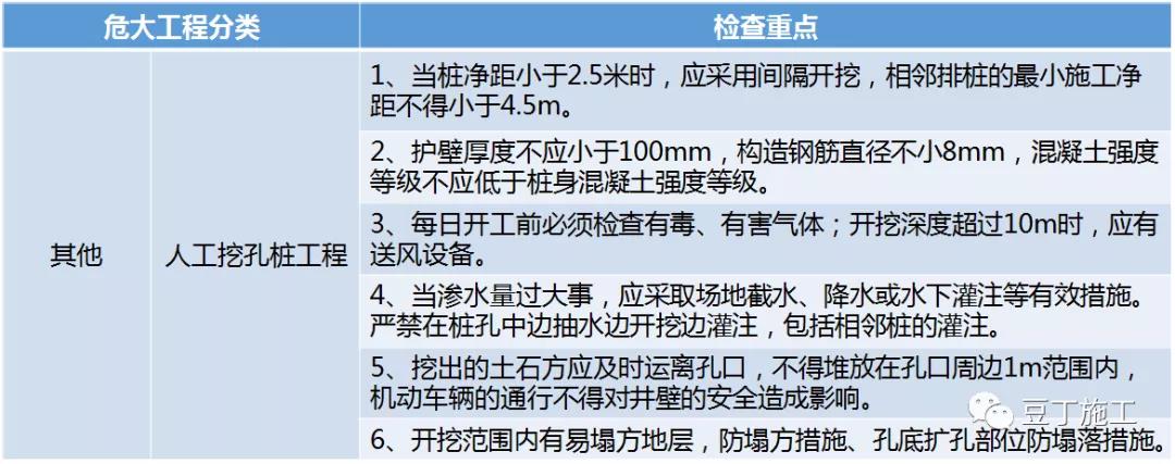 5.檢查要求:人工挖孔樁工程主要材料進場質(zhì)量檢查、抽檢,過程中對照專項施工方案有關(guān)檢查內(nèi)容等。