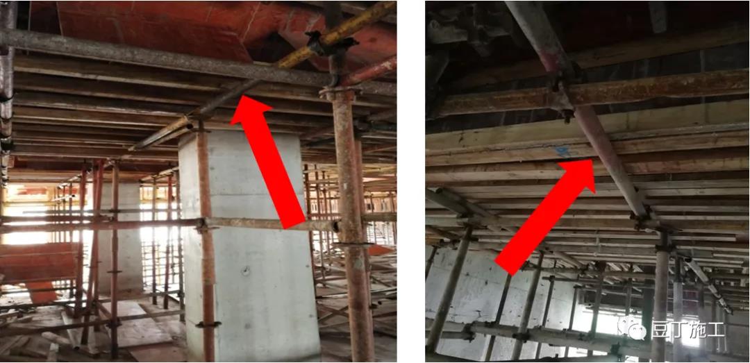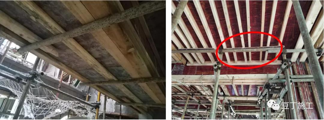 梁底立桿早拆,導(dǎo)致梁底主龍骨懸挑;板底主龍骨端部無固定措施,主龍骨懸挑,樓板下?lián)厦黠@。