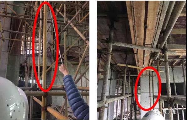板底模架搭設(shè)不規(guī)范,架體缺失水平桿,步距過大,U托自由端長度超標(biāo)、U托歪斜。