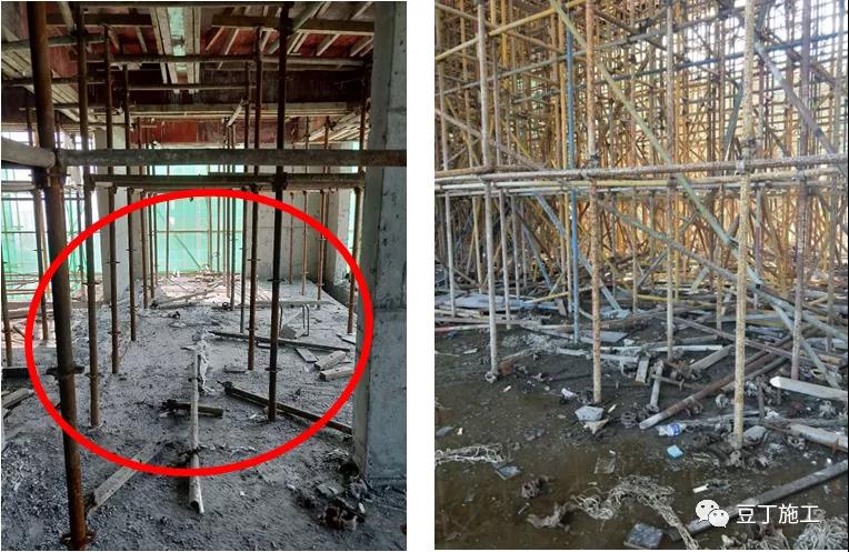 頂層局部缺失支座,支頂器安裝不規(guī)范,關(guān)鍵承重構(gòu)件開裂;
