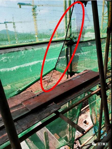 鋼絲繩使用不規(guī)范:采用卸扣和拉環(huán)拉結(jié)、共用拉環(huán)、用一根繩對折使用、與結(jié)構(gòu)摩擦無隔離。